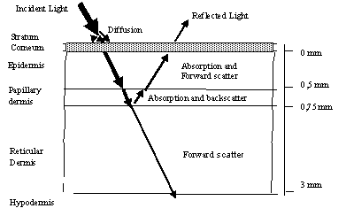 The dermis consists of two sub-layers: papillary dermis and reticular dermis. The dermis consists of collagen fibers and, in contrast to the epidermis; it contains sensors, receptors, blood vessels, and nerve ends. The collagen fibers are thinner in the papillary dermis, and it behaves as a highly back-scattering layer. Any incident light is backscattered towards the surface. Scattering is greater in the red spectrum and going greater to infrared. Because infrared is not absorbed by melanin and blood, this part of the spectrum is best for assessing the papillary dermis’ thickness. The absorption coefficients can describe the papillary dermis for hemoglobin mah(l), the hemoglobin concentration ch—the scattering coefficient for collagen mspd, and the collagen layer’s thickness dpd.